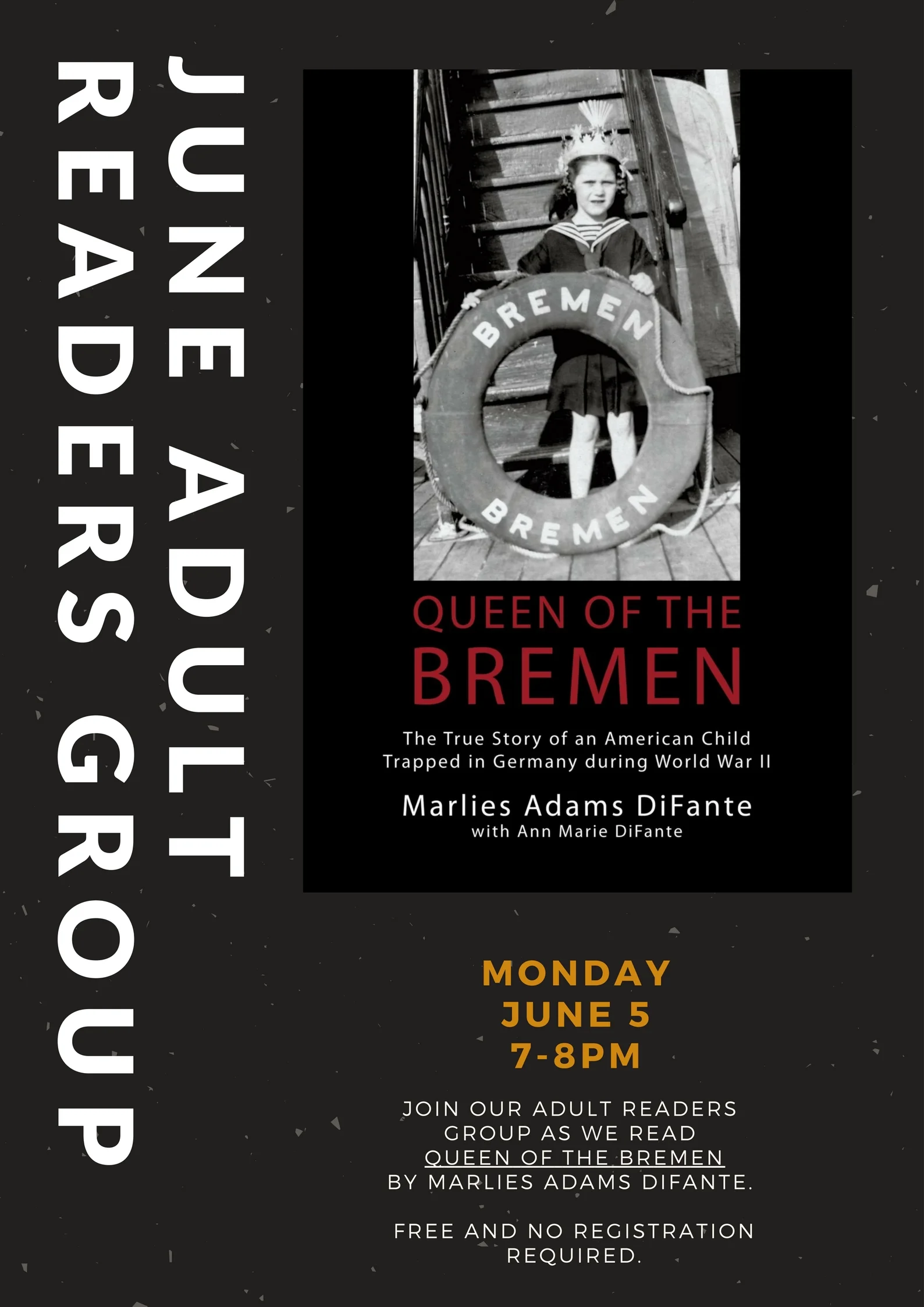 Join our adult readers group for a discussion of "Queen of the Bremen" by Marlies Adams DiFante. We meet at 7pm in the Community Room.