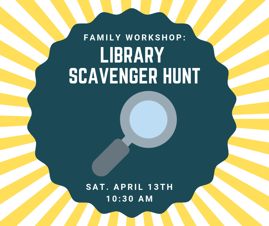 Family Workshop: Library Scavenger Hunt Saturday, April 13, 2019 10:30 AM 11:30 AM 10:30 11:30 Google Calendar ICS Join us for an epic scavenger hunt, which will take you to different places all around the library. You can earn prizes for finishing the hunt! Optional craft. This is a free family event. Registration is appreciated.
