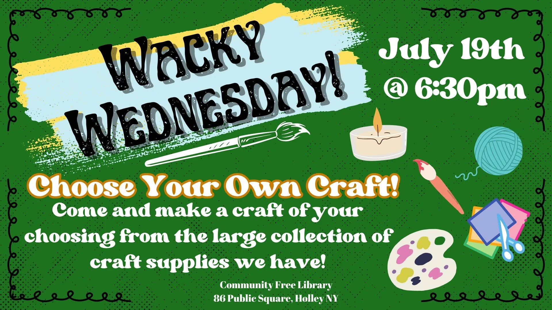 Come and make a craft of your choosing from the large collection of craft supplies we have! Please call or message us to sign up to make sure you have a spot!
