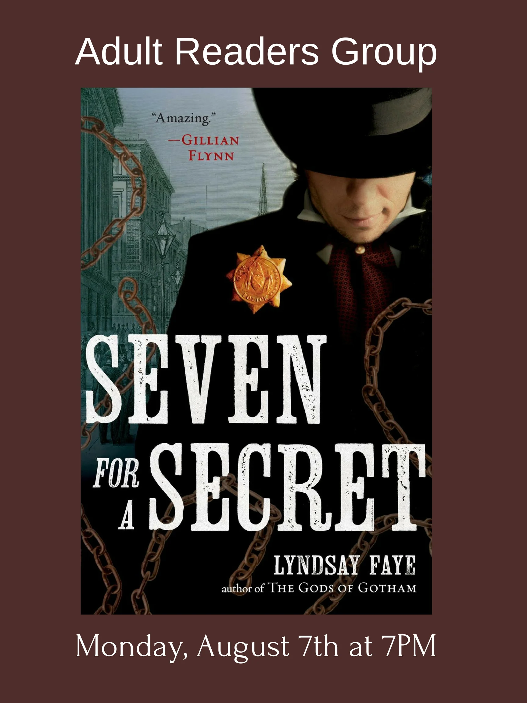 Adult Readers Group Monday, August 7, 2017 7:00 PM 8:00 PM 19:00 20:00 Google Calendar ICS Join our Adult Readers Group as they discuss Seven for a Secret by Lindsay Faye.This group is open to all adults, free to attend, and registration is not required.